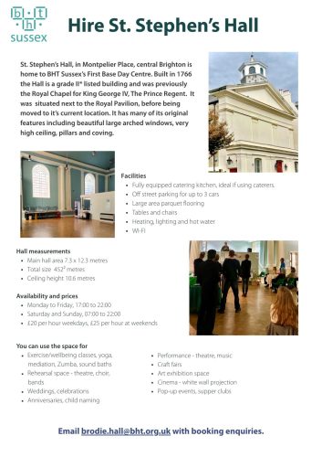 First Base runs out of St. Stephen's Hall, which is available to hire for various purposes.